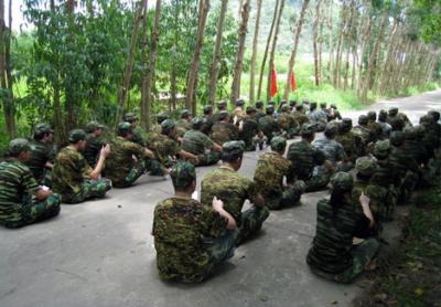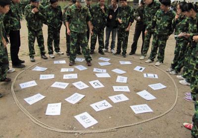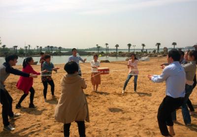 一组队员在特定的时间内,利用所给的毛竹、麻绳、大塑料桶扎出一条结实的竹筏,然后坐在竹筏上面抵达指定的目的地,集体动手创作出劳动成果,坚定目标,同心协力,驶向成功的彼岸。
